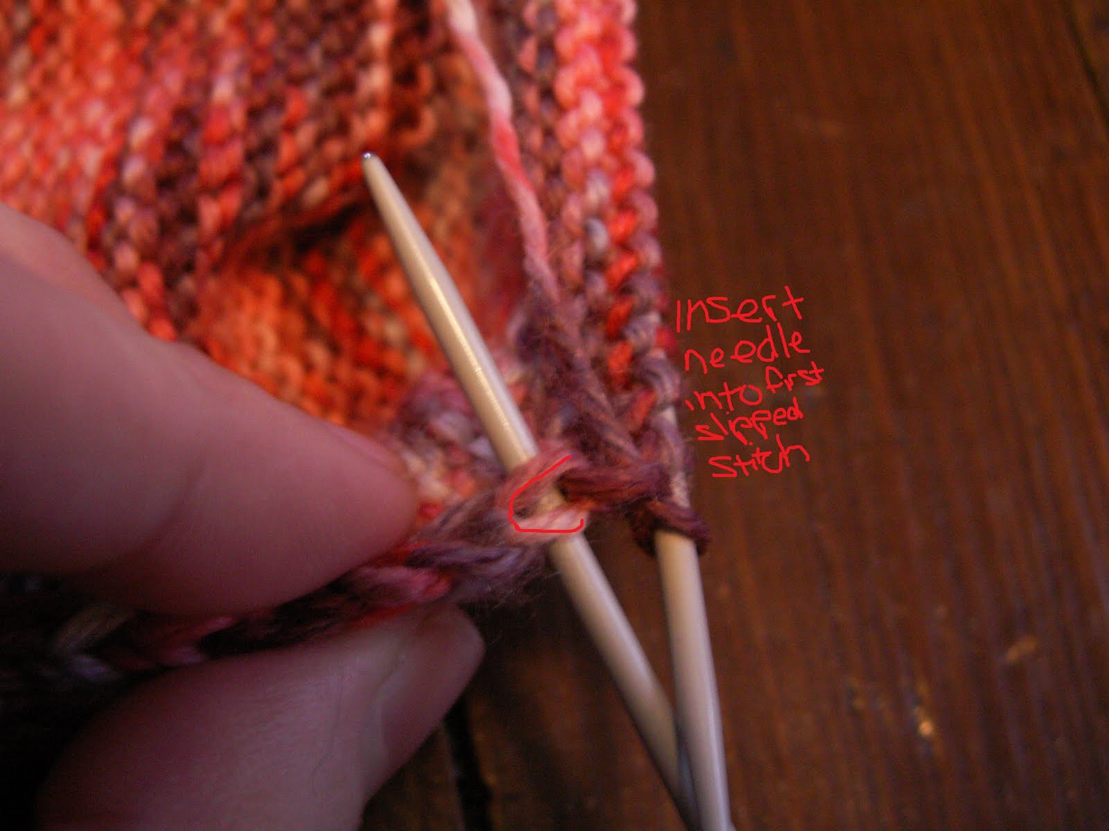 What we need to do to turn those V's into actual stitches on our needles (so that we can once again knit around and around) is to "pick up" stitches. This is not too difficult. You are going to take your empty needle and insert it under the very first V.